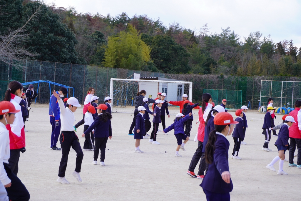 校内持久走大会に向けて走る前の動き作りをし、最後に全校児童対ダイソーでリレー対決を行いました。寒い中での陸上教室でしたが、みんな楽しそうに走っていて元気をもらいました。