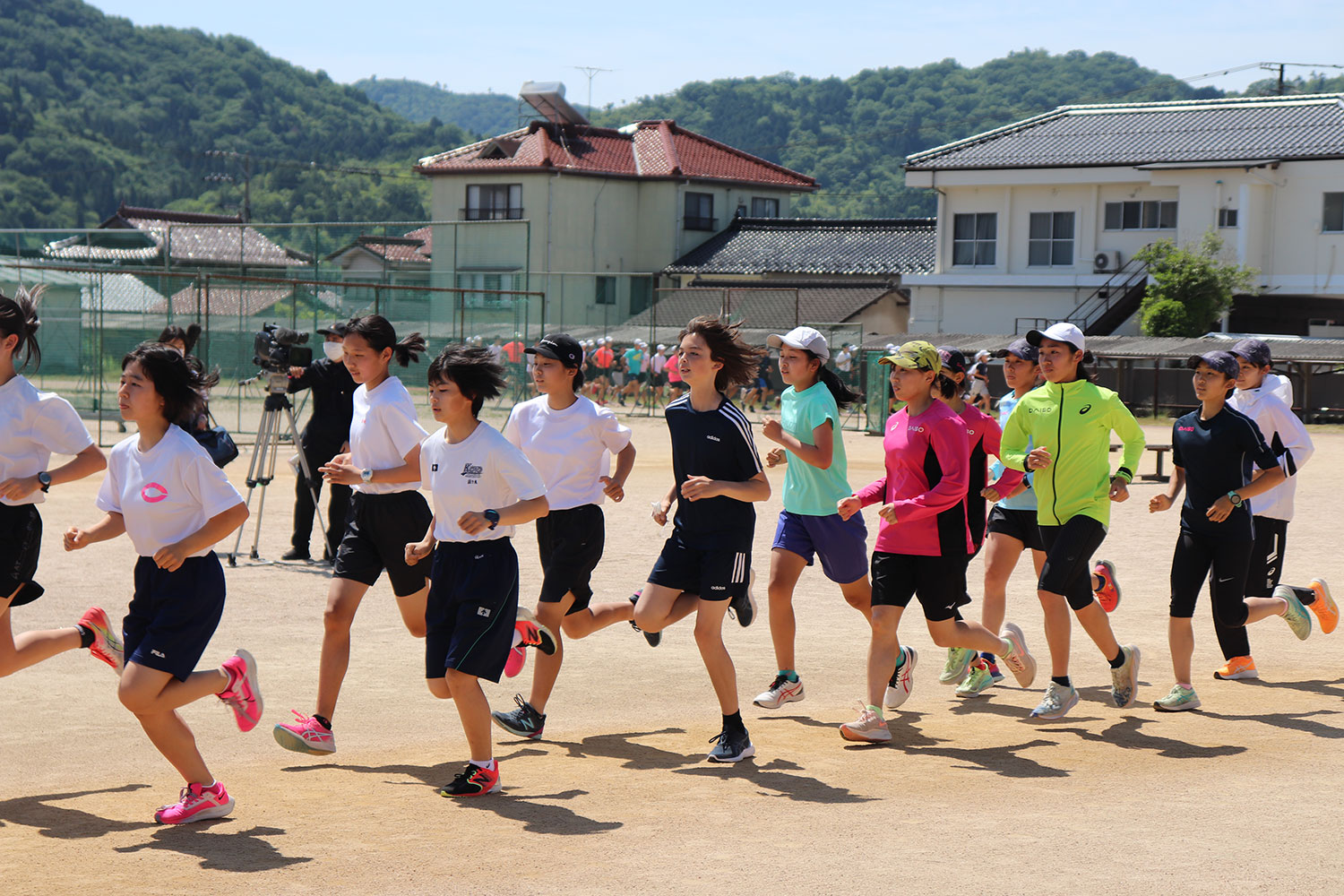 5月29日に世羅町で行われたアスリート育成支援事業「陸上教室」へ参加させていただきました。当日は、菅井洋平さん(ミズノ)が指導する走り幅跳びの教室と、高橋尚子さんがサポートに入った長距離の練習会との2つに分かれて約1時間半ほど教室を行い、ダイソー女子駅伝部はそのサポートをさせていただきました。