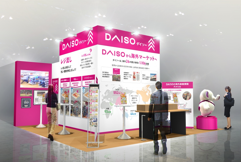 大創産業のブースでは、スーパーマーケットやホームセンターの一角にDAISOを導入いただくことで集客を高める “レジ流し”の導入事例、食品メーカーを対象に海外のDAISOでの食品ジャンル販路拡大支援の解説、法人様向けオンラインショップサービスをご案内いたします。