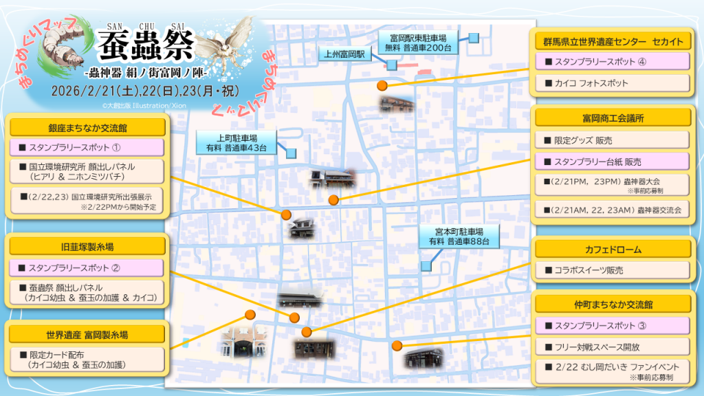 株式会社大創産業(広島県東広島市 代表取締役社長:矢野靖二、以下「大創産業」)は、DAISOオリジナルトレーディングカードゲーム「蟲神器(むしじんぎ)」をテーマにした大会、交流会、スタンプラリーなどのコラボレーションイベント「蚕蟲祭(さんちゅうさい)- 蟲神器 絹ノ街 富岡ノ陣」を、2026年2月21日(土)から2月23日(月・祝)まで、富岡商工会議所や富岡製糸場など群馬県富岡の街を舞台に開催いたします。